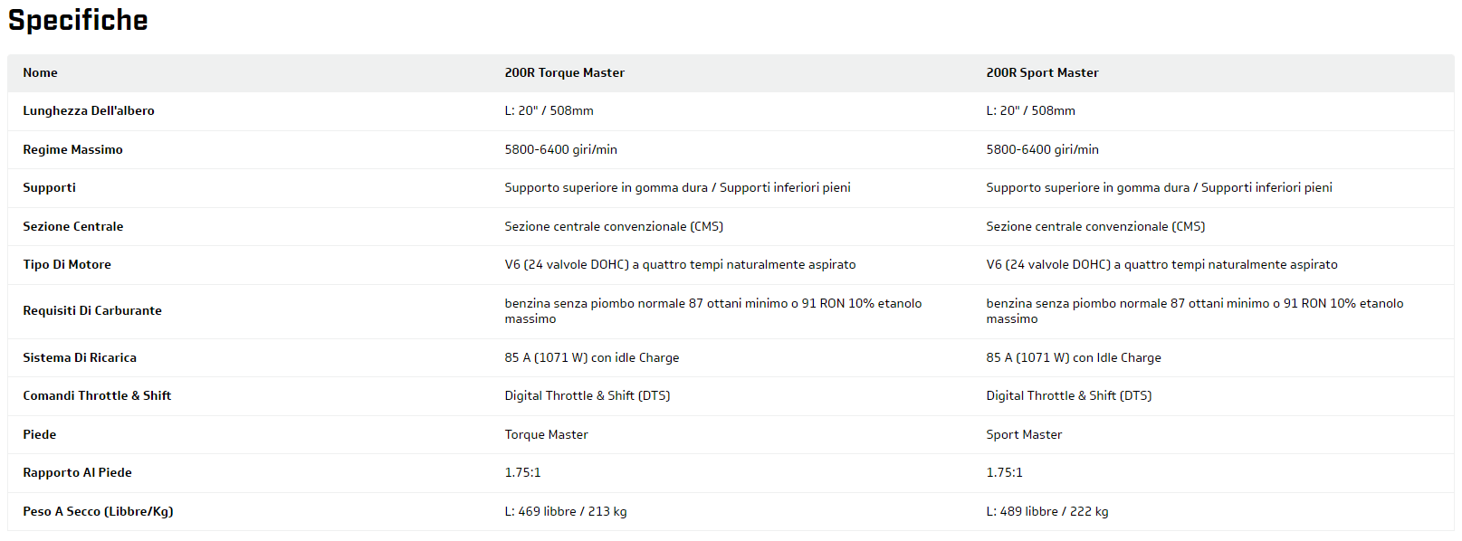 Forte di una cilindrata elevata e del doppio albero a camme, il propulsore V6 da 3,4 litri sviluppa una potenza eccezionale ai medi regimi, per un’accelerazione rapida e una velocità entusiasmante. Con rpm max a 6400 giri/min, il 200R è progettato per erogare una buona dose di potenza e raggiungere velocità elevate, il tutto contenendo peso e ingombri.