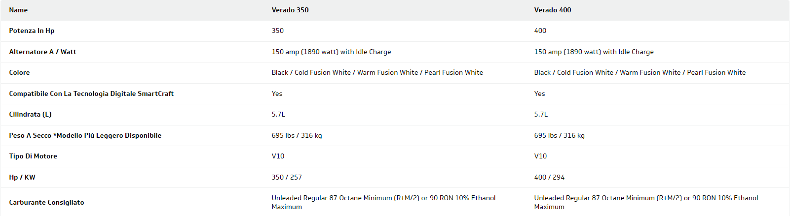 I fuoribordo Mercury® Verado® V10 5.7L da 350 e 400 hp rimangono fedeli alla tradizione della leggendaria gamma Verado offrendo sempre il top in termini di prestazioni. Forte del primo propulsore V10 aspirato della categoria, questi fuoribordo vantano potenza ed capacità straordinarie, grazie alle quali potrai spingerti oltre l’orizzonte in totale sicurezza. Assumi il controllo e naviga senza sforzo con le innovative tecnologie SmartCraft® e i comandi digitali avanzati. I fuoribordo Verado sono straordinariamente fluidi, silenziosi e raffinati, e sapranno trasformare la tua esperienza di navigazione.